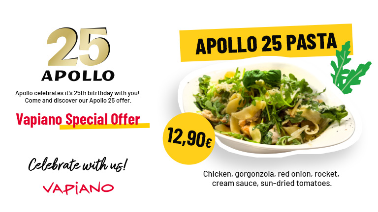 On the last Wednesday of Setember, you´ll find Pasta Carbonara in Vapiano restaurants only €7.60 for all Apollo Club members (regular price €9.50)